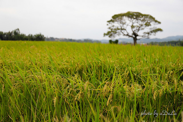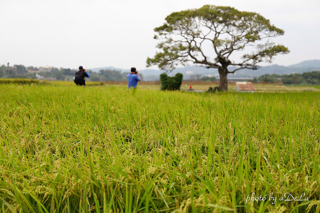 銅鑼窯一旁美景,尚未收割的稻田搭配遠方樹木與土地小廟,心裡有寧靜的感覺。